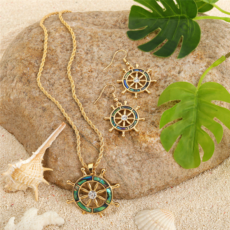 The Abalone Helm Earrings and Necklace Set features a design reminiscent of a helm, adorned with stunning abalone accents, making it an eye-catching and unique addition to your jewelry collection.
